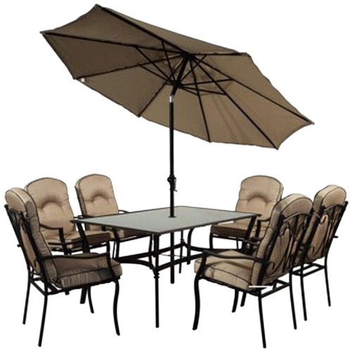 The Carlton Set features a 152 x 96cm rectangular table with granite effect 5mm glass. The six armchairs that are included in this set are stackable, allowing them to be put away when not in use. The chairs also include six padded cushions for your added comfort. The cushions feature a unique coloration, complimenting the rest of the set. Although the cushions are showerproof, it is advised that they are not left out in heavy rainfall, as they may be at risk of being damaged. The table supplied is of a stylish rectangular design, accommodating for all six of the armchairs to fit around the table comfortably. The table top is made from tempered glass. The 280cm crank parasol is supplied in a complimentary colour to the rest of the Carlton set and offers shade in the hotter, brighter months of the year.This is a very sturdy set that is ideal for use on patios and as general garden furniture.
