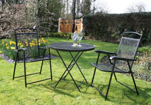 This 3 piece bistro set is ideal for small gardens, patios, balconies or conservatories. The table and chairs are foldable for easy, compact storage. The furniture has a powder coated finish and is rust and weather resistant. Finished in black mesh this set is classic and stylish, suitable for any garden.