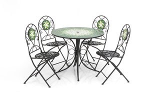 4 seater bistro set with a mosaic inlay table top and matching chair backs.