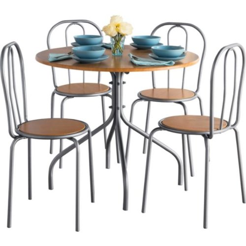 This bistro dining set has a high quality wood effect table on metal legs. Perfect for intimate dinners. Collect in store today. Part of the Vienna collection. Table: Size H75cm. Diameter 90cm. Metal legs. PVC wrap finish. Chairs: 4 chairs. Size of each chair H86.5, W41.5, D43.5cm. Metal frame. Powder coating finish legs. General features: Packed flat for home assembly. Total weight 28.2kg.