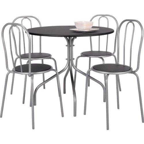 This bistro dining set has a high quality black finish table on metal legs. Perfect for intimate dinners. Collect in store today. Part of the Vienna collection. Table: Size H75cm. Diameter 90cm. Metal legs. PVC wrap finish. Chairs: 4 chairs. Size of each chair H86.5, W41.5, D43.5cm. Metal frame. Powder coating finish legs. General features: Packed flat for home assembly. Total weight 28.2kg.
