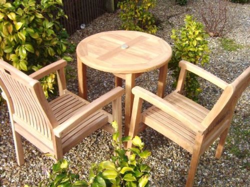 It features a 70cm round bistro table with 2 stackable carver chairs. All of our teak is ethically sourced and manufactured to the highest of stadards to ensure you receive the very best quality for your money.This compact set will suit any small decking or patio area and the chairs can be stacked for storage.L70cm x W70cm x H75cmRound Bistro Table H94cm x W64cm x D57cm (Seat H43cm x W52cm x D46cm)2 x Stacking Armchairs. Factory Direct Discounting. Check out'Parasols/Cushions' forSeat Pads to suit. Requires minimal assembly (TableOnly). FREE UK delivery - Prices inclusive of VAT.