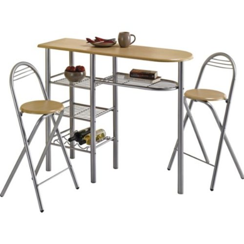 This stylish breakfast dining set is ideal for smaller spaces, consisting of a natural, wood effect table with a silver metal frame. The table includes 2 silver tray shelves for useful storage space, as well as a 3 bottle rack. Complete with 2 high back PVC chairs. Part of the Amelia collection. Table: Size H93, L115, W40cm. Wood effect table. Chairs: 2 chairs. Size of each chair H85.5, W36, D41cm. Silver coloured metal frame. General features: Packed flat for home assembly. Total weight 17.5kg.