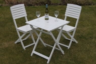 A quality set consisting of a wooden table and 2 chairs. The wood is certified FSC so comes from managed forests. It is finished with a thick coating of gloss white paint which should preserve the wood for many years, although we would recommend covering the set in winter. The chairs and table come fully assembled and simply unfold, so are very easy to store away in the winter. The table has a parasol hole in the centre.The table is 60cms square and 72cms tall. The chairs are 31cms deep, 36cms wide and 88cms tall. Please note parasol and wine not included!