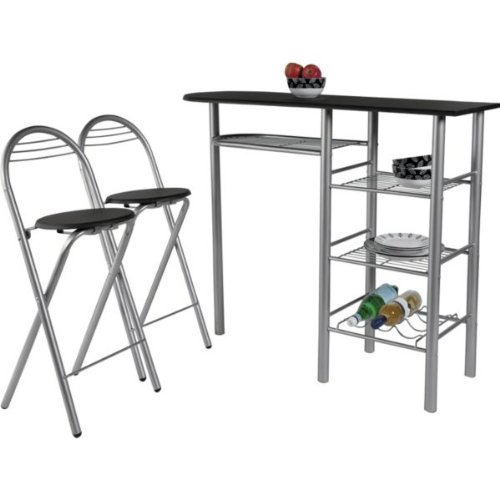 This stylish breakfast dining set is ideal for smaller spaces, consisting of a black, wood effect table with a silver metal frame. The table includes 2 silver tray shelves for useful storage space, as well as a 3 bottle rack. Complete with 2 high back PVC chairs.
