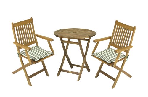 - Enjoy your outdoor settings with this charming bistro set with slatted table top, seat, and chair back design. Chairs easily folds for optimal storage solutions, whether you're trying to save space or want to put away exterior furnishings for inclement weather. You will love having this bistro set for your home. Green/Ivory stripe seat pads are included.