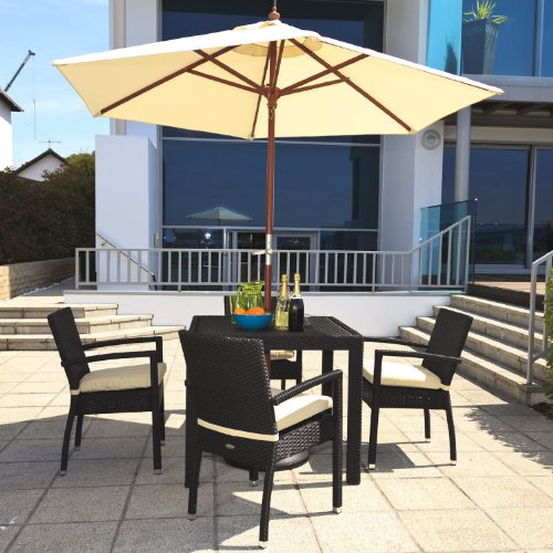 The Cumberland Bistro Set is perfect for intimate dinners. This Cumberland set in black 4 line features Four Stackable Chairs and a Square Rattan Table with 8mm tempered glass, and a 2M wooden parasol with crank, and a 15KG concrete parasol base