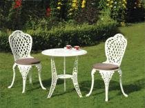 3 PIECE BISTRO SET - HAMMERED CREAM FINISH - MADE FROM 100 PERCENT CAST IRON - COMES WITH 2 CUSHIONS - TABLE DIAMETER 1.1 METRES - PARASOL HOLE IN THE TABLE